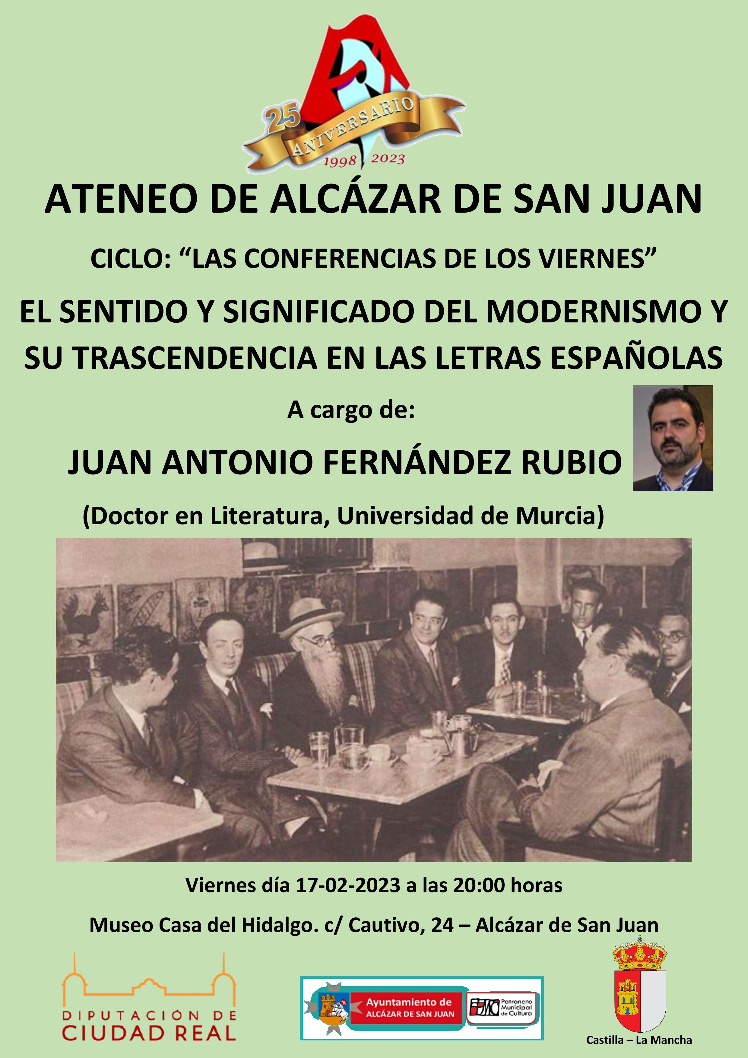 El doctor en Literatura, Juan Antonio Fernández Rubio, participará este viernes en una conferencia dentro del Ateneo de Alcázar denominada “El sentido y significado del modernismo y su trascendencia en las letras españolas”. La conferencia tendrá lugar en la Casa del Hidalgo el próximo viernes 17 de febrero a las 20:00 horas. La entrada a la conferencia es libre hasta completar aforo.