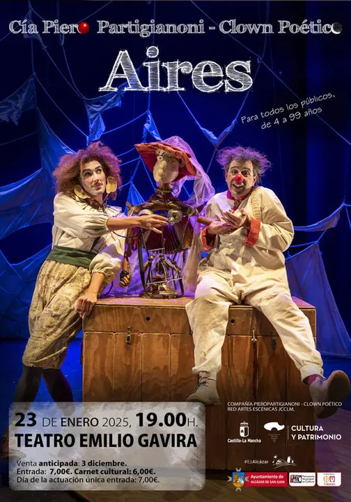 La compañía Pieropartigianoni- Clown Poético pondrá este jueves, a partir de las 19 horas, sobre el escenario del Teatro Emilio Gavira de Alcázar de San Juan la obra "Aires", un espectáculo incluido en el programa de la Red de Artes Escénicas de la Junta de Comunidades de Castilla-La Mancha con un clown atrapado en su mundo ideal como personaje principal.