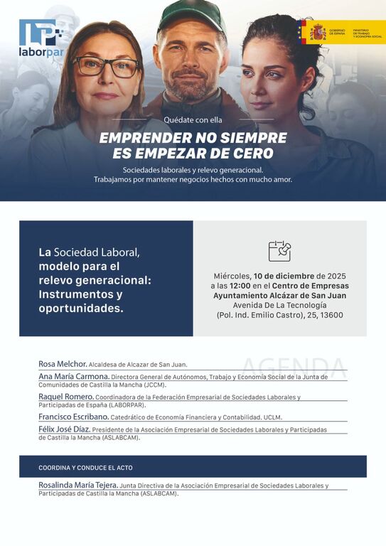 En el acto intervendrán Rosa Melchor, alcaldesa de Alcázar de San Juan; Ana María Carmona, directora general de Autónomos, Trabajo y Economía Social de la Junta de Comunidades de Castilla‑La Mancha; Raquel Romero, coordinadora de LABORPAR; Francisco Escribano, catedrático de Economía Financiera y Contabilidad de la Universidad de Castilla‑La Mancha y Félix José Díaz, presidente de la Asociación Empresarial de Sociedades Laborales y Participadas de Castilla‑La Mancha (ASLABCAM).El acto estará coordinado por Rosalinda María Tejera, miembro de la junta directiva de ASLABCAM.