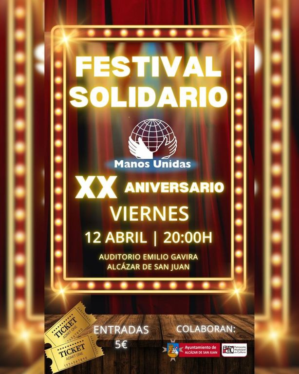 Manos Unidas en Alcázar de San Juan, dentro de la Campaña contra el Hambre 2024, ha programado para este fin de semana, concretamente este viernes12 de abril, su tradicional Festival contra el hambre, que se celebrará en el Teatro Municipal Emilio Gavira a las 20.00 h.