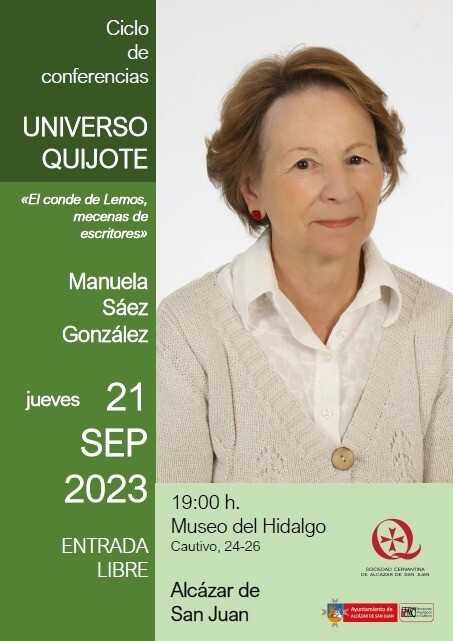 Enmarcada en el Ciclo de Conferencias «Universo Quijote» tendrá lugar la conferencia de la Doctora Manuela Sáez González titulada “El conde de Lemos, mecenas de escritores”, será este jueves 21 de septiembre a partir de las 19:00 horas en el Museo del Hidalgo de Alcázar de San Juan.