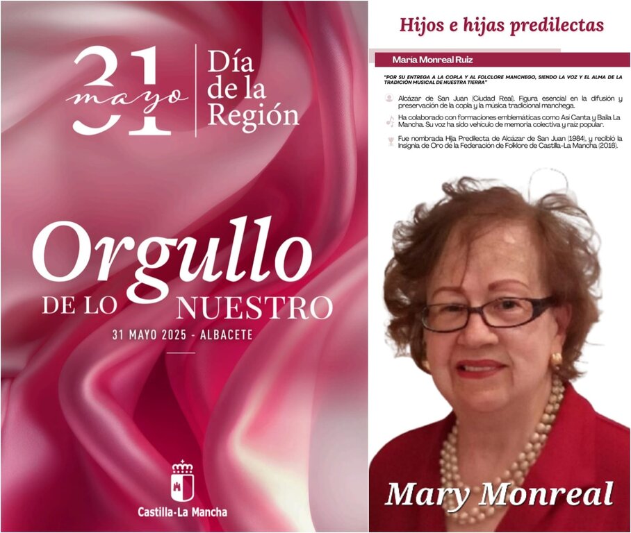 La alcazareña Mary Monreal, el criptanense Luis Cobos, el socuéllamino Juan Miguel del Real y la Unidad de ELA del Hospital Mancha Centro, vinculados en distintos ámbitos a nuestra comarca, figuran este año entre las personalidades o entidades que serán reconocidos el día 31 de mayo, en el acto institucional del Día de la Región, previsto este año en el Palacio de Congresos de Albacete bajo el lema "Orgullo de lo nuestro".