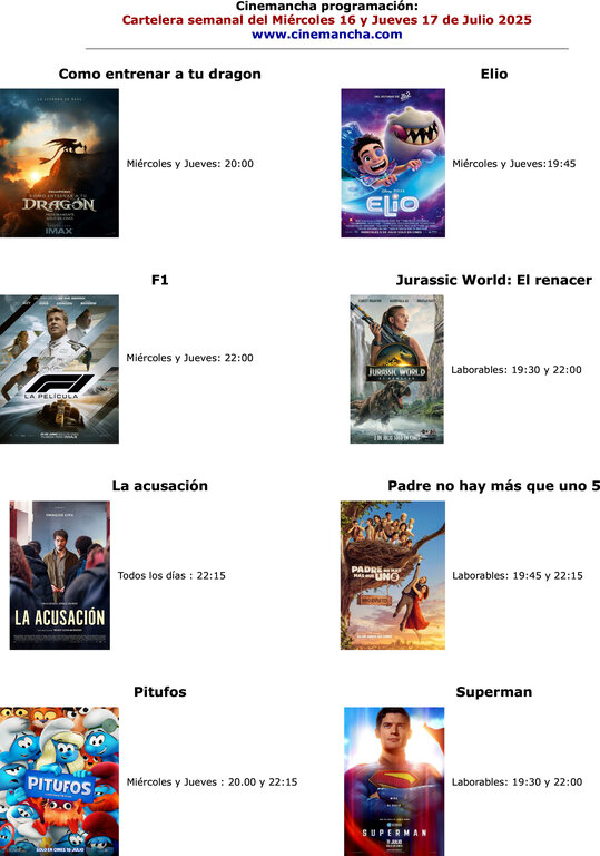 Multicines Cinemancha, en Alcázar de San Juan, presenta su cartelera completa junto a los esperados estrenos del miércoles 16 y jueves 17 de julio de 2025. Con salas equipadas con sonido digital 7.1 y el compromiso de ofrecer siempre los mejores estrenos, la experiencia cinematográfica está garantizada.