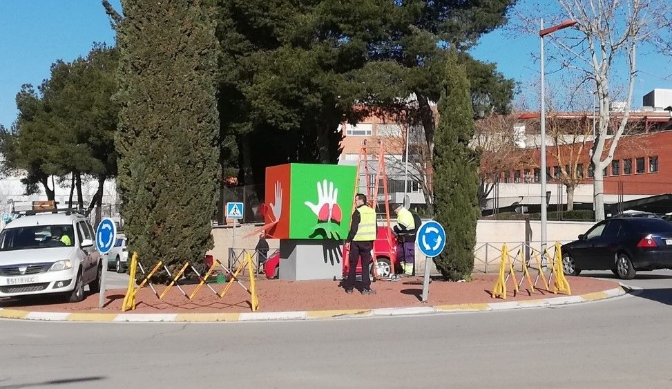 Esta misma mañana, como puede verse en la fotografía, se estaban llevando a cabo los trabajos para instalar la referida escultura en la rotonda donde confluyen la calle Toledo y la avenida de la Constitución, una figura cúbica de colores de la que salen diversas manos con órganos, como homenaje a los donantes.