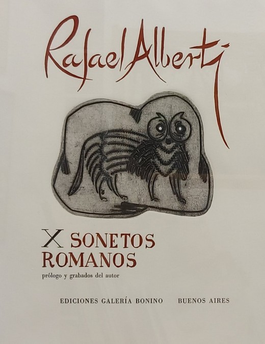 En la exposición podemos contemplar la Carpeta "X Sonetos Romanos" Ediciones Galería Bonino (1964), la cual, se acabó de imprimir en el Istituto Grafico Tiberino, Roma. Con ella ganará el Primer Premio de Grabado en la V Raseggna d`Arte Figurativo di Roma en 1966. Son Grabados realizados sobre planchas de zinc y plomo, estos últimos, utilizando una técnica desconocida en Europa en aquellos años. Cada obra se compone de un soneto y un grabado creados por Rafael Alberti.