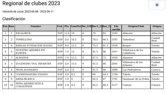 Se han contado por victorias los enfrentamientos con la Peña Ajedrecística Conquense, Coordinadora de Toledo y Dama Blanca de Quintanar de la Orden. Mientras que se han cosechado derrotas ante: Tomelloso y Bargas, equipos que en la 6ª y última ronda empataron entre sí, logrando de esta manera el 2º y 3º puesto, respectivamente. Por consiguiente, la clasificación final ha quedado así: