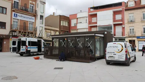 La alcaldesa de Alcázar de San Juan, Rosa Melchor y la concejala de Turismo, Bárbara Sánchez Mateos, han visitado esta mañana las obras de la plaza, para presentar la nueva Oficina de Turismo, actualmente en construcción en la zona del" Jardinillo". Se trata de una estructura prefabricada en la que se ha invertido algo más de 59.000 euros, para trasladar el servicio de información turística a este céntrico lugar, mucho más visible y accesible que el actual (en uno de los bajos del mercado municipal, pero mucho más escondido).