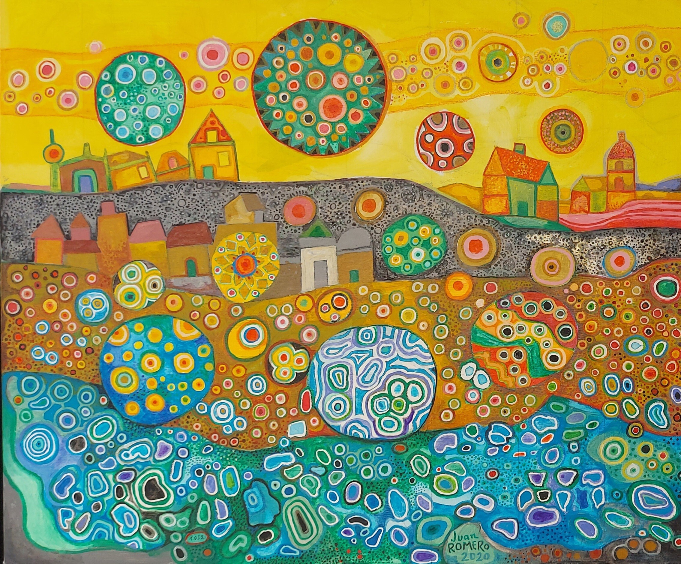 Romero, Juan Romero, un hacer para la gloria, fuerza del ser, energía que transforma la materia en sueño. Nefelibata y hacedor de primaveras, a sus noventa encarna la imagen de un ángel de la pintura. Sevillano de nacimiento, parigot de elección, madrileño de adopción, hizo desde sus inicios, cabe el Sena, pintura onírica. Aquella etapa parisina, bizantina y mandálica, kleana y mántica, es una almáciga donde la pintura es semilla, que siempre acaba floreciendo, perfumando.