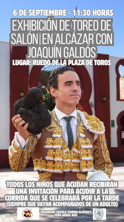 El diestro Joaquín Galdós protagonizará una exhibición de toreo de salón el próximo 6 de septiembre de forma matinal en la plaza de toros de Alcázar de San Juan, e invitará a los niños y niñas de la ciudad a los toros, ya que por la tarde toreará la corrida de su Feria y Fiestas. Así, el torero peruano protagonizará a partir de las 11:30 horas la exhibición y entregará una invitación para la corrida a cada niñ@ que acuda con la que podrán acceder a la plaza siempre y cuando vayan acompañados de un adulto.