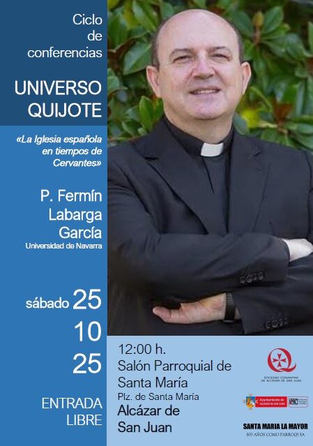 En la mañana del sábado 25 de octubre y dentro del Ciclo de Conferencias «Universo Quijote», tendrá lugar la interesante conferencia «La Iglesia española en tiempos de Cervantes», que impartirá el sacerdote riojano don Fermín Labarga García. Será a partir de las 12:00 en el salón parroquial de la iglesia de Santa María la Mayor, la parroquia más antigua de la diócesis de Ciudad Real, que en 2026 cumplirá el octingentésimo (800) aniversario de su fundación.