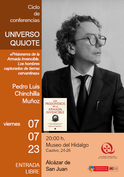 El viernes 7 de julio a las 20:00 horas en la Casa del Hidalgo, Pedro Luis Chinchilla impartirá una conferencia titulada Prisioneros de la Armada Invencible. Los hombres capturados de tierras cervantinas. Esta conferencia será gratuita y abierta al público, está incluida dentro de la programación UNIVERSO QUIJOTE, que viene organizando la Sociedad Cervantina de Alcázar de San Juan para abrir la asociación al público en general y para que los alcazareños que lo deseen puedan acercarse al conocimiento de Miguel de Cervantes, su obra y la interesante época en que le tocó vivir.