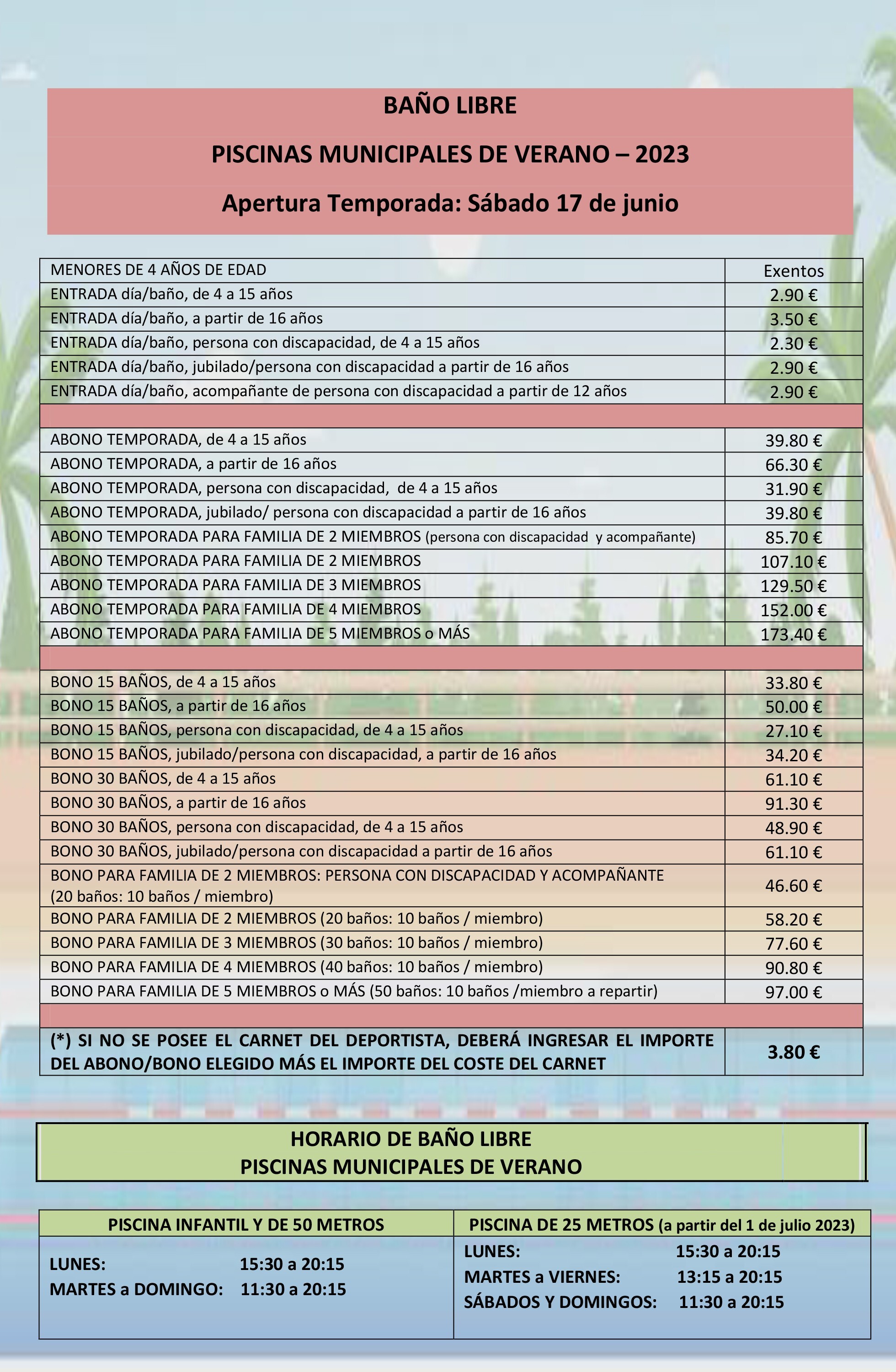 Desde ya mismo, todos aquellos ciudadanos interesados en hacer uso y disfrute de la piscina pueden adquirir sus abonos de temporada o bonos de baño, siguiendo las instrucciones publicadas MÁS ABAJO y en la página web del Instituto Municipal de Deportes, donde podrán comprobar la tabla de precios para este verano.