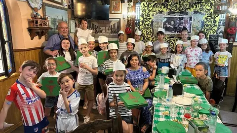 Unos 25 niños han tenido ocasión de divertirse, saborear y al mismo tiempo aprender cómo se hacen las inimitables pizzas del tabernero Víctor García, quien acompañado por su familia ha querido compartir taller y restaurante con estos pequeños, colaborando un año más con la Feria de los Sabores.