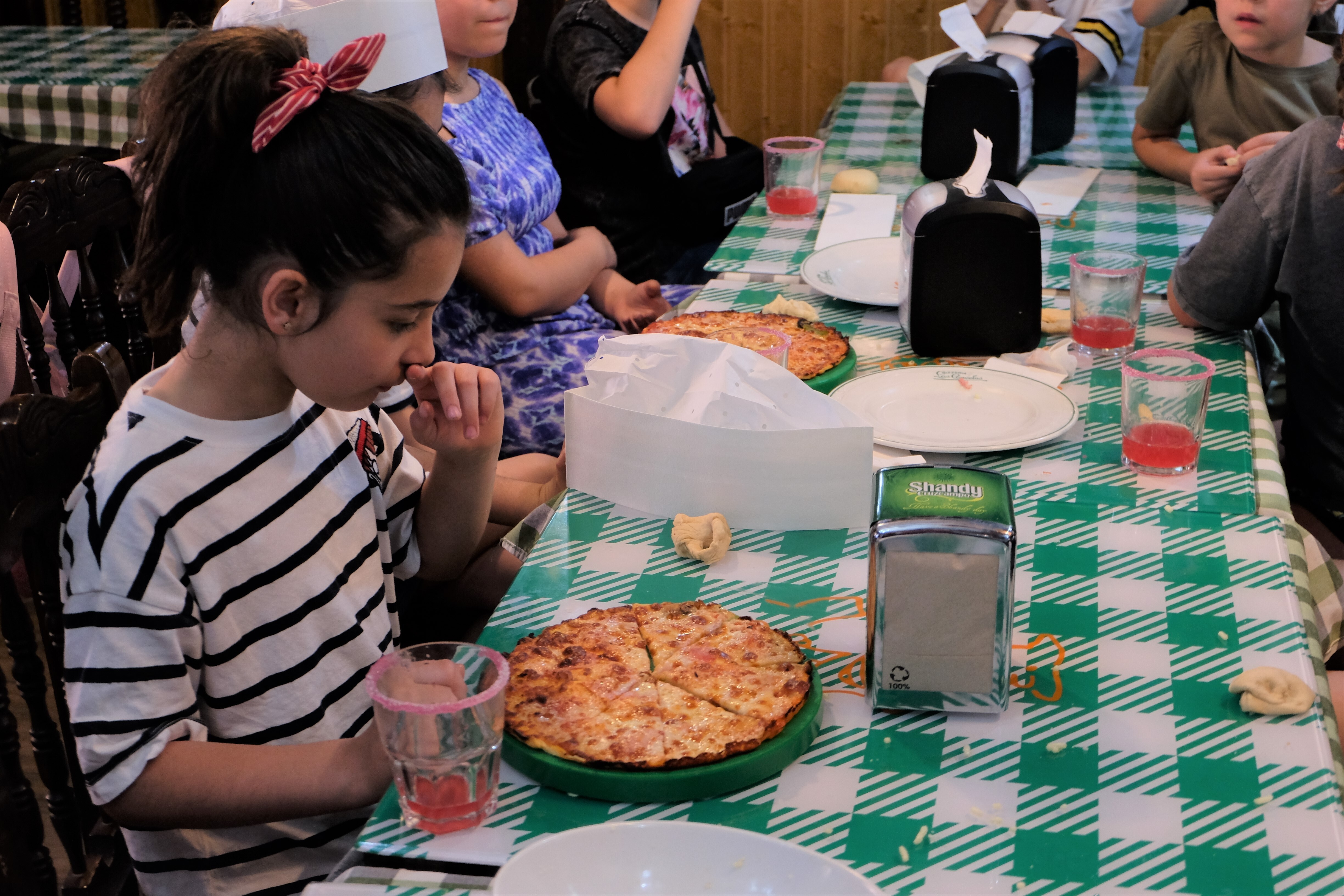 Los pequeños cocineros han hecho sus pizzas y elegido los ingredientes, las han visto cocer en el horno e incluso han aprendido a elaborar un cóctel de acompañamiento, llamado "Para echar a volar", a base de refrescos de naranja y limón, con granadina (sin alcohol por supuesto) y hielo, servido con el borde del vaso fresa azucarado