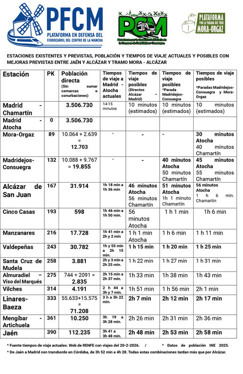 “De esta forma, y sin desviarnos de nuestro objetivo principal que es el tramo Mora – Alcázar y la estación de Madridejos-Consuegra, damos respuesta a una reivindicación transversal en toda la línea Madrid – Alcázar de San Juan – Jaén. Además, mantendremos unas excelentes relaciones con las plataformas en defensa del ferrocarril en Linares-Baeza y la provincia de Jaén, con la Plataforma en Defensa del Ferrocarril Público, Social y Sostenible de Castilla-La Mancha y con la Coordinadora Estatal por el Tren Público, Social y Sostenible”, ha manifestado García-Moreno.