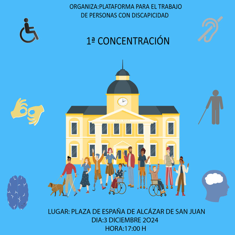 La Plataforma para el Empleo de las Personas con Discapacidad ha convocado su primera concentración "para un trabajo digno para las personas con discapacidad", el próximo día 3 de diciembre, a las 17 horas, en la Plaza de España de Alcázar de San Juan, coincidiendo con el día internacional de las personas con discapacidad.