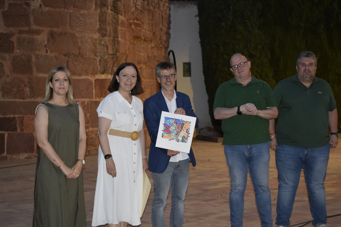 El acto, conducido por el periodista José Manuel Álvarez, también sirvió para dar a conocer el cartel de las fiestas de Moros y Cristianos 2025, obra del pintor alcazareño Salvador Samper basada en una imagen de Luis Miguel Comino. Samper explicó que la imagen tiene dos elementos fundamentales, el negro de la noche festera y sus inconfundibles tonos vivos propios de su pintura. Momento emotivo en el que el pintor local no perdió la ocasión de recordar a su madre, fallecida hace unos meses, y a su padre.