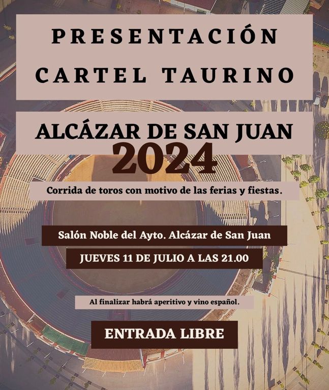 El salón noble del Ayuntamiento de Alcázar de San Juan acogerá este jueves, 11 de julio, a partir de las 21 horas y con entrada libre, el acto de presentación del cartel de la corrida de toros de la Feria de Alcázar de San Juan. El festejo, del que informaremos más detalladamente en los próximos días, contará con tres destacadas figuras del toreo, se celebrará el viernes de Feria y será ofrecido por la misma empresa que el año pasado, Velagua Eventos S.L.