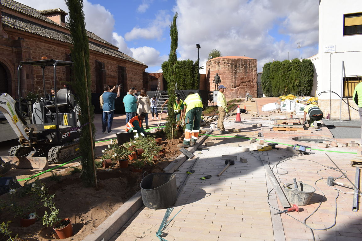 La reforma integral de la Plaza de Santa María, cuyo presupuesto ronda el medio millón de euros en una superficie de 4.000 m2, está llegando a su fin, y a partir de este viernes ya se podrá disfrutar en casi su totalidad para la celebración de los actos culturales y festivos que tendrán lugar con motivo de las fiestas patronales y de la vendimia en Alcázar, de hecho, el escenario en el atrio de Santa María ya está montado y las nuevas jardineras que atraviesan la zona están casi terminadas, tal como se ha podido comprobar en la visita realizada este jueves por la alcaldesa, Rosa Melchor, el concejal de Obras, Javier Ortega y el gerente de la empresa Intedhor, José María Ropero.