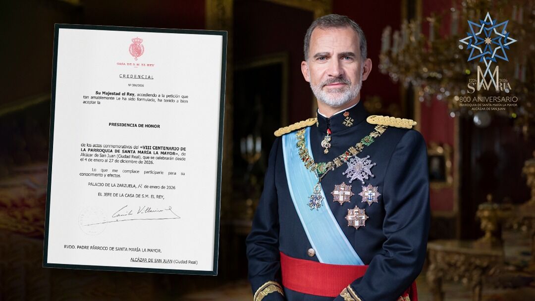 El Rey Felipe VI ha aceptado presidir como Presidente de Honor los actos conmemorativos del VIII Centenario de la parroquia de Santa María la Mayor de Alcázar de San Juan. La designación se produce a propuesta de la Comisión Organizadora, que ha trasladado al monarca el proyecto completo del programa conmemorativo.