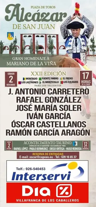 XXII Edición del Festival de subalternos de Alcázar de San Juan, que será un emotivo homenaje al albaceteño Mariano de la Viña, subalterno de Enrique Ponce de toda la vida, a quien una gravísima lesión apartó de los ruedos.