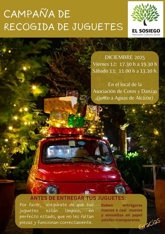 La Asociación Cultural y Social El Sosiego vuelve a poner en marcha su tradicional campaña de recogida de juguetes, una iniciativa solidaria con la que cada año se busca que ningún niño o niña se quede sin ilusión en Navidad. La recogida se realizará en Alcázar de San Juan los próximos días viernes 12 de diciembre, en horario de 17:30 a 19:30 horas, y sábado 13 de diciembre, de 11:00 a 13:30 horas.