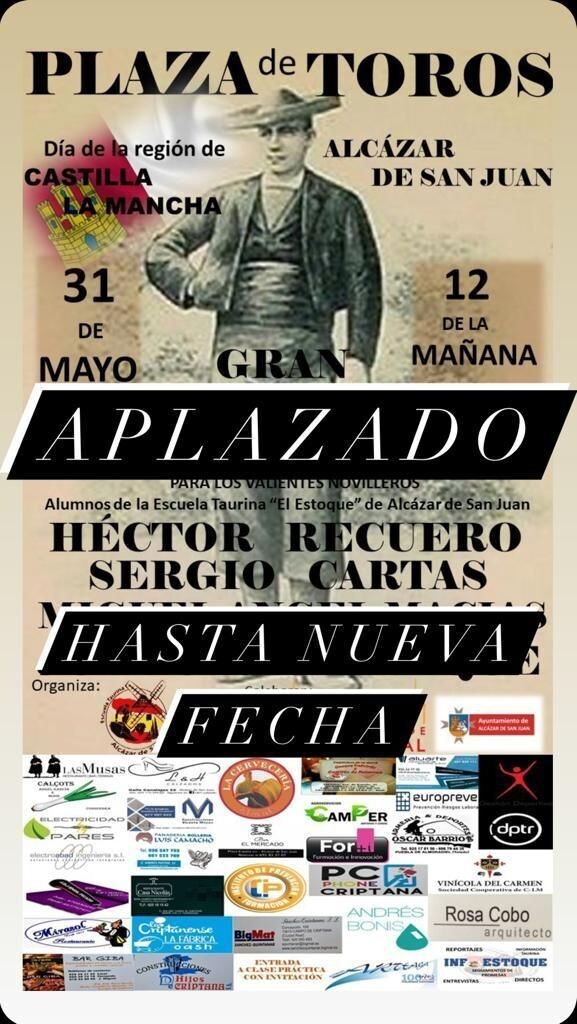 En un comunicado, la dirección de la Escuela Taurina El Estoque de Alcázar informa que en los próximos días se anunciará una nueva fecha, quedando por tanto aplazada la clase práctica programada para el día 31 a las 12 horas, pues el ruedo está impracticable (Las invitaciones para entrar serán las mismas).