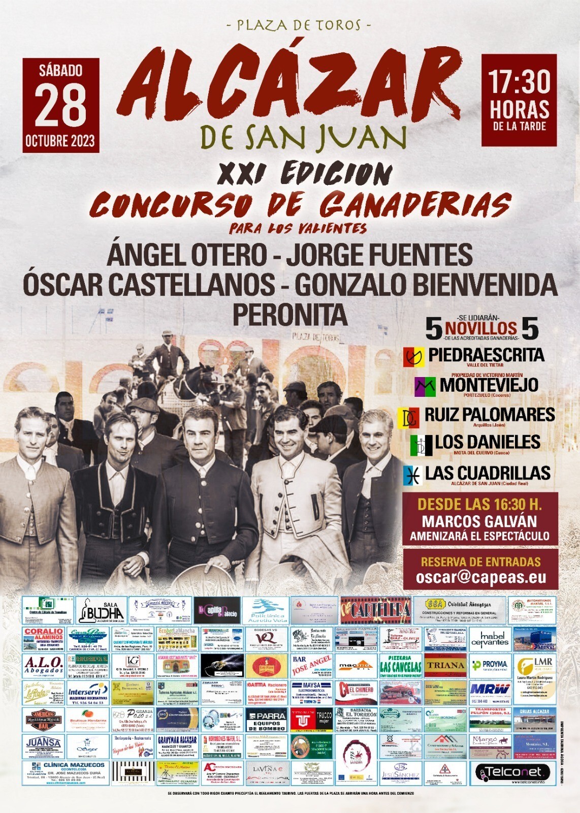 La plaza de toros de Alcázar de San Juan acogerá, el sábado 28 de octubre, d.m. y si el tiempo no lo impide, la XXI edición del festival concurso de ganaderías que todos los años organiza el alcazareño Óscar Castellanos, en esta ocasión para los valientes Ángel Otero, Jorge Fuentes, el propio Óscar, Gonzalo Bienvenida y Peronita.