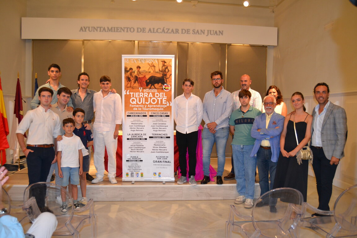 El Salón Noble del Ayuntamiento de Alcázar de San Juan acogió este martes la presentación oficial de la V Ruta Taurina “Tierra del Quijote”, una iniciativa de la Escuela Taurina local "El Estoque" que, en su quinta edición, recorrerá seis municipios de la provincia con clases prácticas para alumnos y novilleros, con entrada gratuita. El acto congregó a autoridades locales, responsables y alumnos de la escuela, familiares y numerosos aficionados.