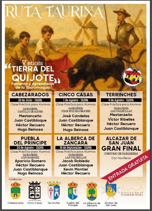 Durante la presentación, Jaime Castellanos, uno de los fundadores de la Escuela Taurina junto a José Lucas y Pepe Botella, subrayó que “este año celebramos el décimo aniversario de la Escuela, con el mismo objetivo de siempre: sacar nuevos valores y fomentar la cantera de Alcázar y su comarca”. Según destacó, la Ruta comenzará el 26 de julio en Cabezarados y pasará también por Cinco Casas, Terrinches, Puebla del Príncipe y La Alberca de Záncara, antes de celebrar su gran final en Alcázar de San Juan el 21 de septiembre.