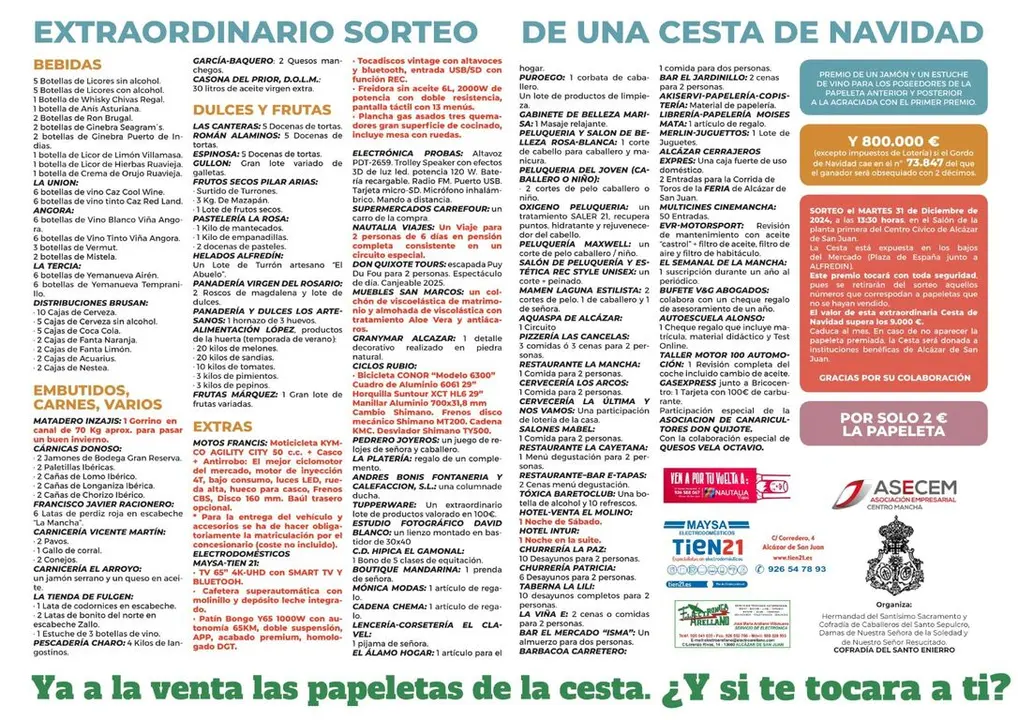 Por sólo 2 euros se pueden ya comprar las papeletas de esta Cesta de Navidad extraordinaria, con productos y servicios que la persona ganadora va a tener que disfrutar a lo largo de todo un año, por su volumen y por la oportunidad de saborear todo lo bueno que una ciudad como Alcázar, a través de su tejido comercial y de servicios, ofrece.