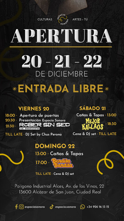 Ubicado en la Avenida de los vinos, 22, en el Polígono Alces de alcázar, la apertura tendrá lugar este viernes a las 18:00 horas, siendo la presentación de Espacio Sonora a las 20:30 horas. En este primer día de un fin de semana cargado de actividades, actuará en concierto @robersinsed, seguidos de la mejor música con @chus59perona.