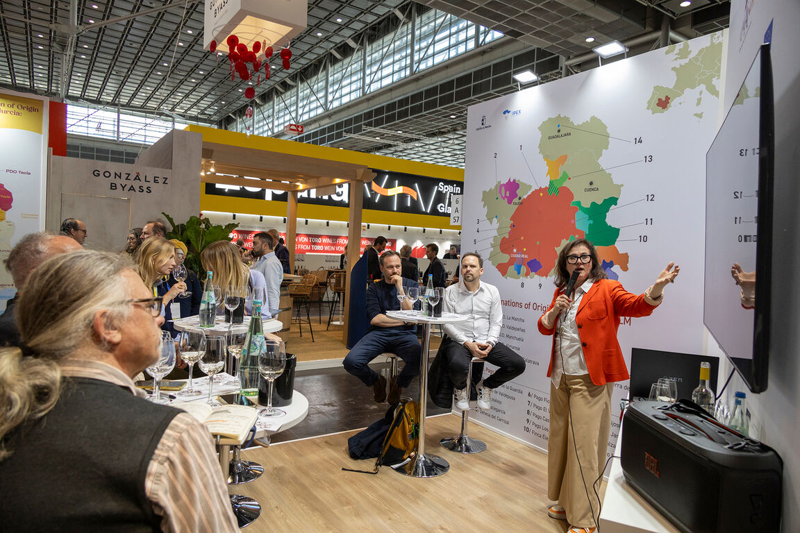 En esta edición, Prowein 2026 ha contado con 4.000 expositores de más de 65 países, representando a más de 500 regiones vitivinícolas. Tras la anfitriona Alemania e Italia, España ha contado con una nutrida presencia de bodegas asistentes a Prowein 2026. La participación concreta de los vinos manchegos se ha circunscrito al stand de Castilla-La Mancha, donde han estado presentes en un túnel de cata. “En total, 23 bodegas y tres denominaciones de origen (Almansa, Jumilla y La Mancha) intentando generar toda la imagen de calidad de los vinos de la región”, como ha matizado Luis Quintín, responsable del IPEX-CLM.