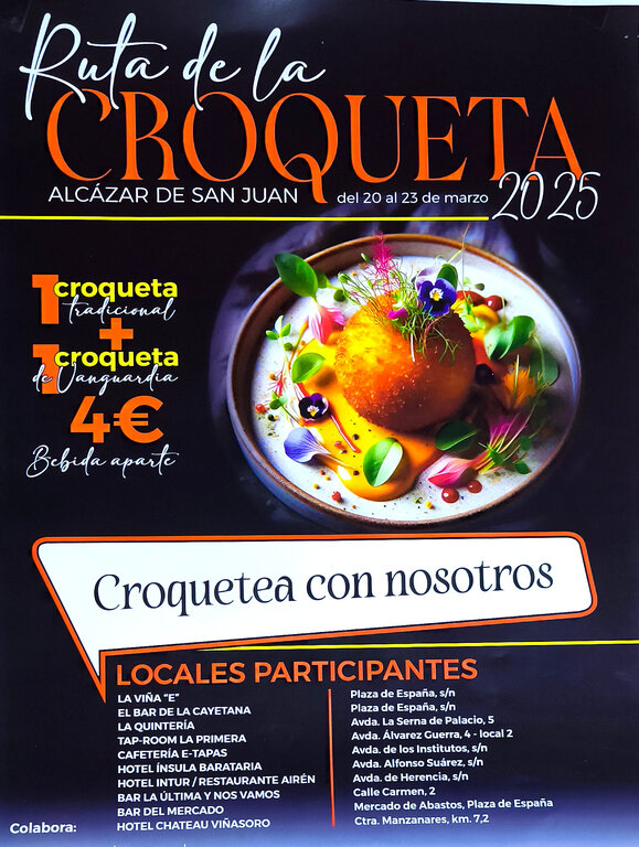 La Asociación Empresarial Centro Mancha y la Concejalía de Turismo de Alcázar de San Juan han presentado esta mañana una nueva edición de "La Ruta de la Croqueta", un evento que se celebrará en diez restaurantes, bares y cafeterías de la localidad, durante los días comprendidos entre el 20 y el 23 de marzo.