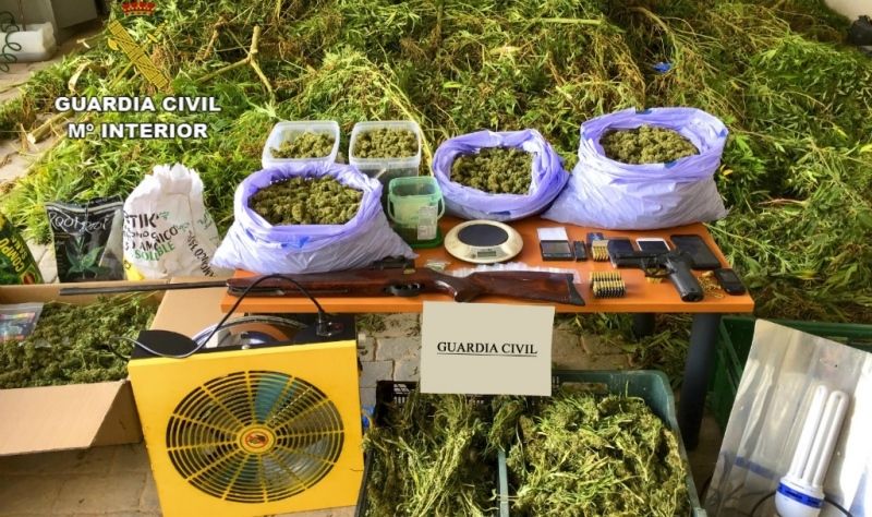 Durante el registro, la Guardia Civil intervino veinticuatro plantas de marihuana de gran tamaño, con un peso de 360 kilogramos, 9,420 kilogramos de cogollos de marihuana dispuestos para su venta, dos basculas de precisión, bolsitas de envasado para la venta de la sustancia, dos invernaderos, material eléctrico necesario para el cultivo de esta sustancia, semillas, abonos, un equipo de secado portátil utilizado para el secado de la marihuana así como teléfonos móviles y joyas.