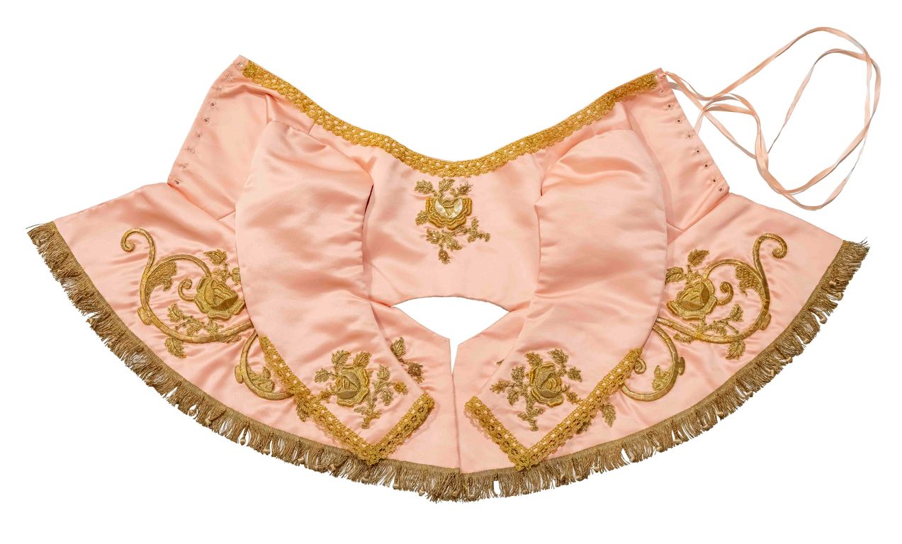Las tres piezas están fabricadas en un raso de color salmón, con un bordado en oro de realce, y rematadas con un galón dorado. Cuando llegaron a la Real Fábrica de Tapices presentaban suciedad superficial y manchas (producidas por el uso), alteración de color y pérdida de los elementos decorativos.