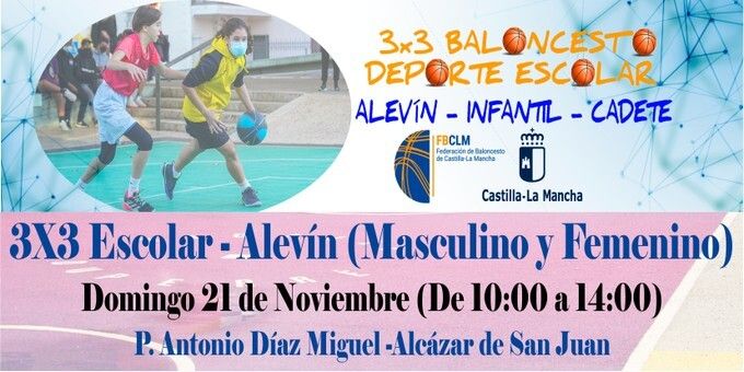 El primer Circuito 3x3 de baloncesto en Edad Escolar llega a nuestra región. El Torneo se celebrará en el Pabellón Antonio Díaz Miguel de Alcázar de San Juan el 21 de Noviembre en horario de 10:00 a 14:00 horas. Ese domingo 21 se celebrará la primera prueba del 3x3 escolar, se realizará en la categoría alevín masculina y femenina.