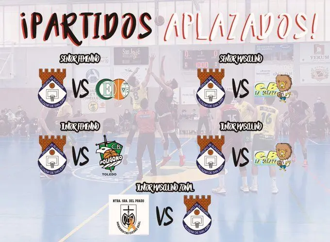 Debido a las medidas implantadas por la Consejería de Sanidad, estableciendo el Nivel 3 en todas las poblaciones de la provincia de Ciudad Real, la responsabilidad de los clubes de preservar la salud de todos sus deportistas y técnicos e evitar contagios innecesarios, las recomendaciones federativas y los acuerdos mutuos en los clubes afectados este fin de semana, se ha decidido que hasta cinco partidos de diferentes categorías del Grupo 76 Alkasar se hayan tenido que aplazar. Es el caso de los dos partidos en categoría senior, el masculino que estaba programado para este sábado a partir de las 20:00 horas en el pabellón Antonio Díaz-Miguel frente al Frutas Doña Ramoncita La Solana, choque destacado y estelar de la 5ª jornada de la liga comunitelia, entre el segundo y el tercer clasificado, y el senior femenino que debía enfrentar a las alcazareñas en la jornada matinal del domingo a partir de las 12:00 horas al CB CEI Toledo, en encuentro correspondiente a la 4ª jornada de liga en el que podría haber revivido la gran final del Trofeo JCCM de hace varias semanas en el Antonio Díaz-Miguel.