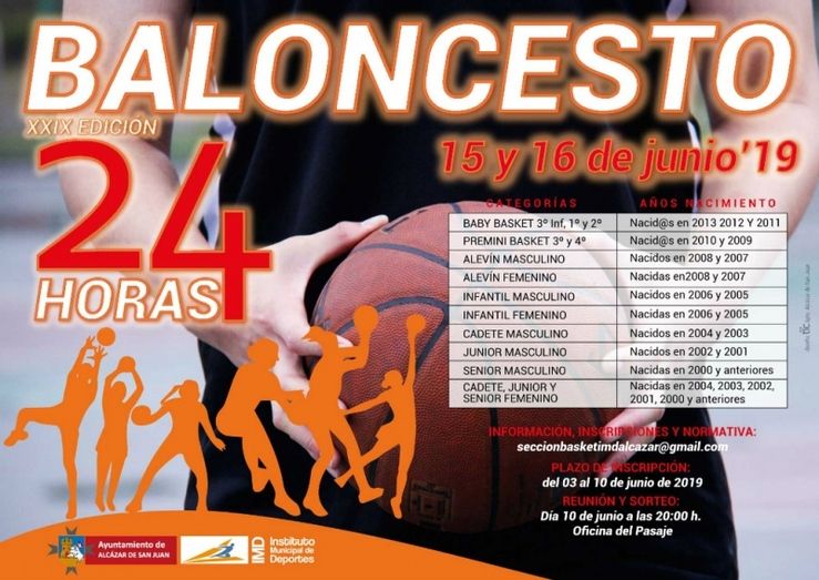 El Ayuntamiento de Alcázar de San Juan ha convocado la XXIX edición de las 24 horas de Baloncesto, que se van a celebrar el 15 y 16 de junio en categorías que van desde Baby bascket (tercero de infantil y primero y segundo de primaria) hasta senior masculino, y para féminas se han convocado las categorías de cadete, Junior y senior.
