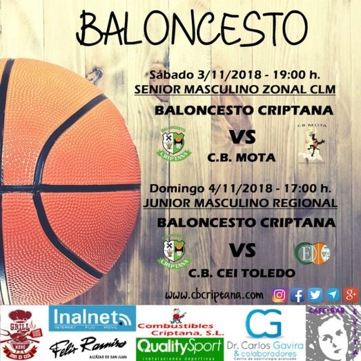 A pesar del puente de noviembre los equipos federados del Baloncesto Criptana disputaran una nueva jornada de liga. El equipo senior masculino recibe el sábado en Criptana al CB Mota mientras que las senior femeninas viajan el domingo hasta Talavera de la Reina, ese mismo día pero por la tarde los junior reciben al CEI de Toledo. El sábado por la mañana los infantiles y cadetes reciben en Quintanar al Guadalajara Basket , mientras que el equipo infantil femenino juega contra Quintanar un nuevo partido amistoso.