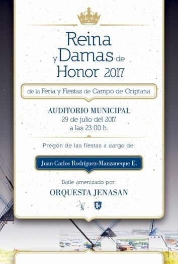 Será durante el transcurso del acto que tendrá lugar en el Auditorio de verano a partir de las 11 de la noche, y en el que las jóvenes Gema Sánchez, Ana Isabel Escribano, Rocío Naranjo, Isabel Gil, Mary Flor Alberca, Alicia García-Casarrubios y Virginia Violero se convertirán en el nuevo séquito de este año. Ellas serán las que continuarán esta tradición con casi cincuenta años de historia y en la que también tiene lugar el Pregón inaugural de las fiestas que en esta ocasión será pronunciado por el científico criptanense Juan Carlos Rodríguez-Manzaneque Escribano.