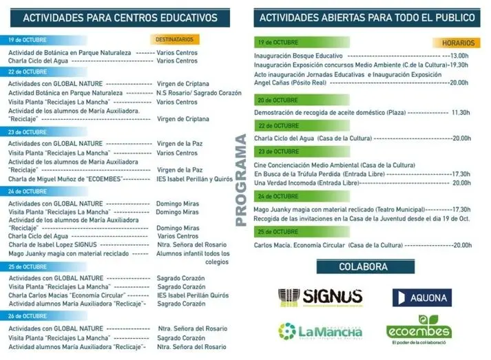 Olivares ha detallado también que, todas las actividades estarán respaldadas por profesionales vinculados al medio ambiente, como el escultor Ángel Cañas, el mago Juanki o el periodista y presentador Roberto Brasero, quien participará en la clausura de estas jornadas el próximo viernes 26 de octubre. Un acto en el que también ser hará entrega de los premios a la ‘Excelencia Educativa’.