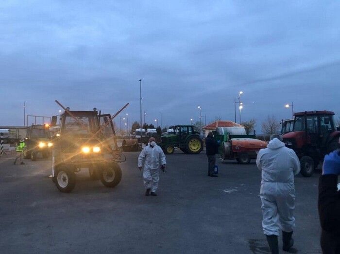 Las tareas de desinfección han dado comienzo a las siete de la mañana con tractores y atomizadores, por lo que ya se pedía estos días de atrás que en la medida de lo posible se guardasen los coches en el interior para dejar libre todo el espacio posible para desinfectar en profundidad con los atomizadores.