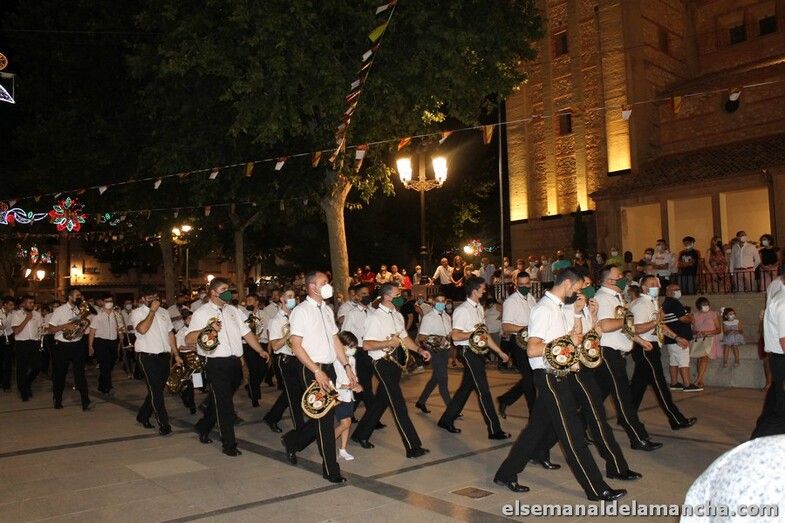Tras el cobetazo, las bandas de música del Cristo de la Elevación y la Filarmónica Beethoven animaron la noche con su música y los cabezudos, par, posteriormentem inaugurarse el recinto ferial,