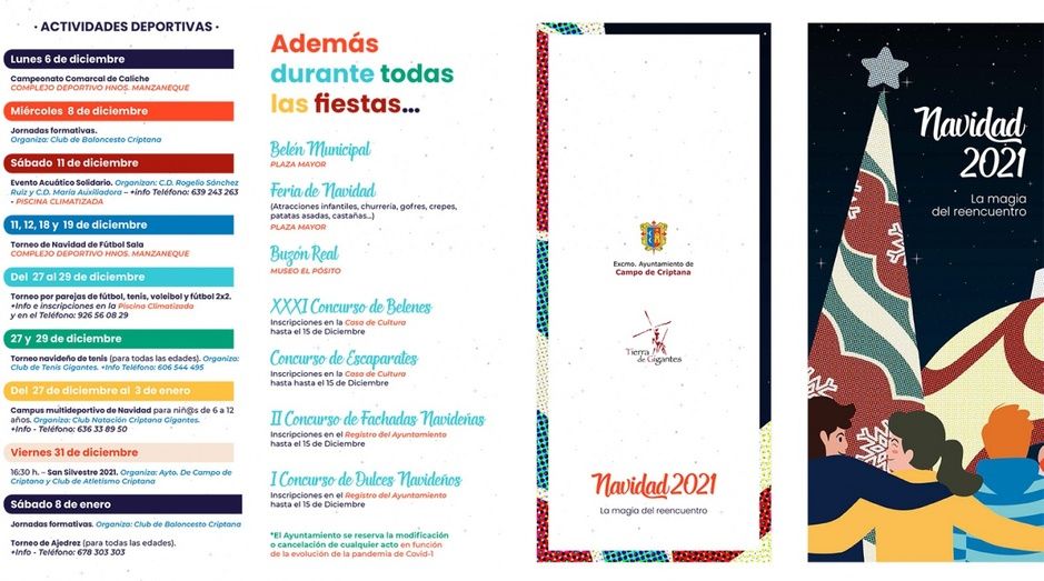 Los concejales de Festejos, Cultura y Deporte de Campo de Criptana, Berna Manzaneque, Rosana Fernández y José Andrés Ucendo, respectivamente, han presentado esta mañana el programa de actividades previsto para la Navidad. Más de 50 iniciativas, lúdicas, festivas, culturales y deportivas, dirigidas especialmente al público infantil para favorecer la conciliación familiar, que darán comienzo este sábado, 4 de diciembre y se prolongarán hasta el 9 de enero.