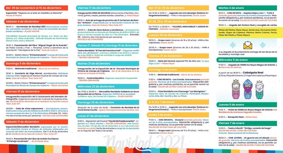 Como actividad estrella se recupera la Feria de Navidad, con atracciones infantiles, churrería, patatas asadas, etc. en la plaza mayor; así como los tradicionales desfiles del Cartero Real y Cabalgata de Reyes, previstos los días 4 y 5 de enero, respectivamente.