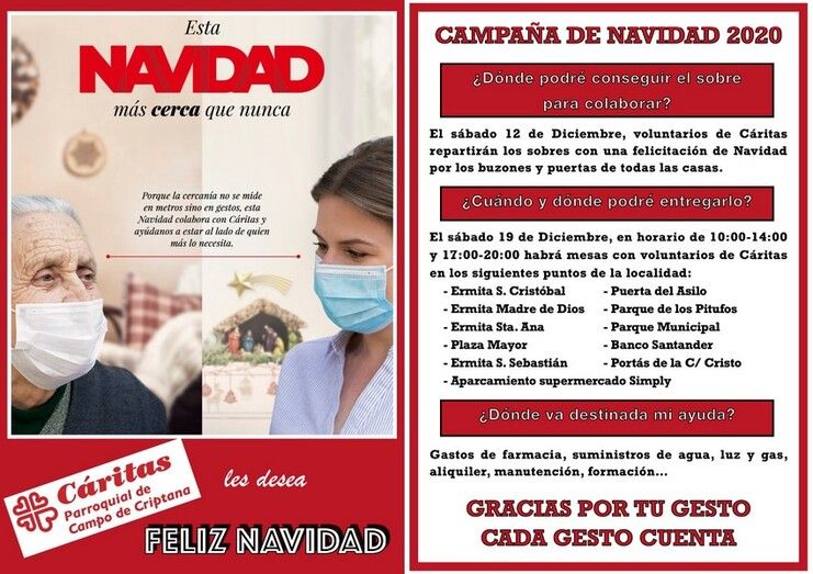 Desde Cáritas Parroquial de Campo de Criptana informn que la campaña de Navidad se realizará este sábado, 19 de diciembre y se hará adaptándose a las nuevas exigencias de los tiempos complicados que vivimos.