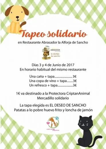 La Asociación Protectora de Animales "CriptanAnimal", en colaboración con el restaurante Abrasador La Alforja de Sancho organizan los días 3 y 4 de junio un tapeo solidario.