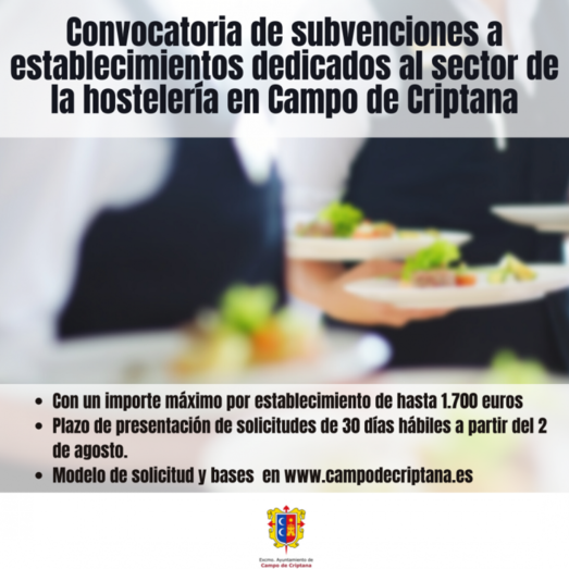 El Ayuntamiento de Campo de Criptana ha convocado por segundo año consecutivo subvenciones para los establecimientos dedicados al sector de la hostelería en la localidad. Desde el equipo de Gobierno, conscientes de los efectos negativos que tuvo para el sector el cierre decretado a comienzos de año para evitar la expansión de la COVID-19, pone en marcha esta línea de ayudas.