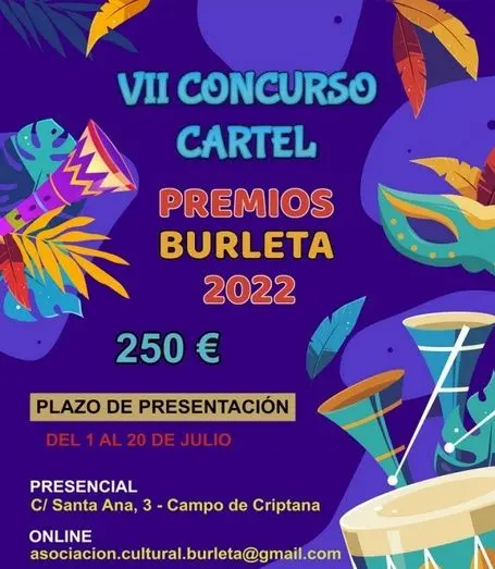 Las bases del VII Concurso del Cartel pueden consultarse en la página oficial del Burleta en Facebook: “Asociación Cultural El Burleta” y en caso de duda, pueden ponerse en contacto con la Junta Directiva a través de Facebook o del correo: asociacion.cultural.burleta@gmail.com